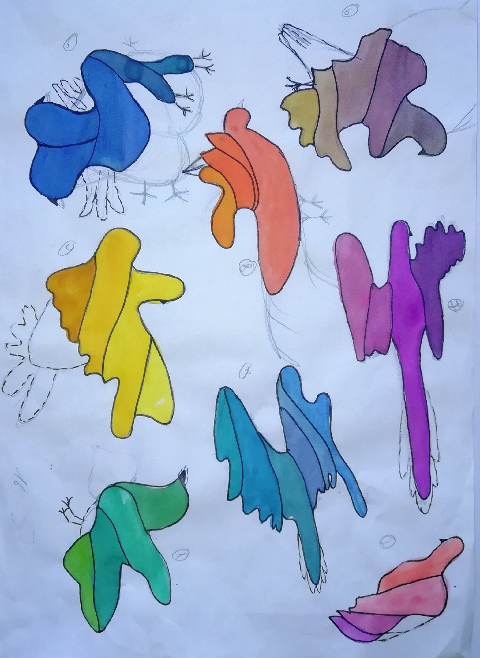 Creating abstractions on paper and supplementing them with dotted lines that allow the viewer to understand the artist's intent, or rather to come closer to understanding how these abstractions fit the bird theme.